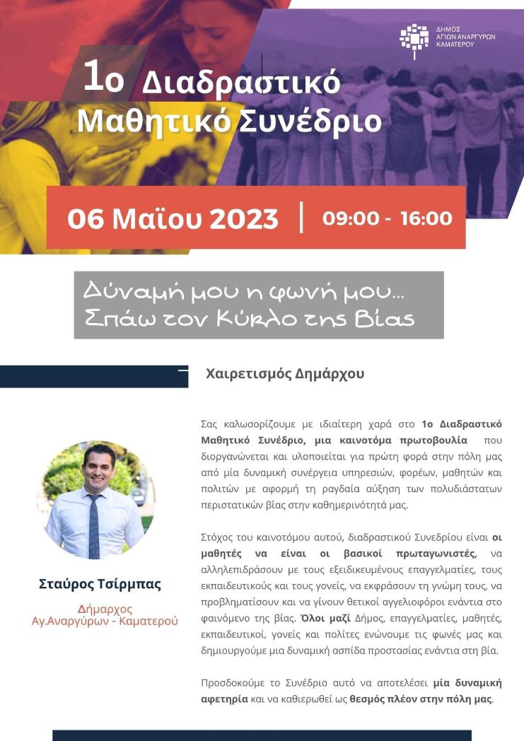 Σας προσκαλούμε στο 1ο Διαδραστικό Μαθητικό Συνέδριο που διοργανώνεται για πρώτη φορά στον Δήμο Αγίων Αναργύρων-Καματερού με θέμα: